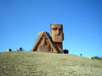 Через десять километров притормаживаем около каменного «стакана», напоминающего пост ДПС. Оказывается, это и есть граница. К фасаду здания контрольно-пропускного пункта прикреплен герб непризнанной Нагорно-Карабахской Республики. Высокогорный погранпост именуется неблагозвучно: «Аговно», что в переводе с армянского звучит уже возвышенно: «Голубь». Рядом с каменным поклонным крестом – хачкаром, установлено три флагштока, но знамени - два. Карабахский флаг отличается от армянского только белыми зубцами, которые символизируют расколотый народ.