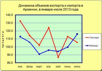 Июль текущего года ознаменовался довольно редким для нашей экономики явлением: по темпу роста импорт намного опередил экспорт – 115,8% против 105,7%. За долгое время такого не было, чтобы разница между этими двумя составляющими внешнеторгового оборота Армении достигала двузначной цифры (10,1 процентных пункта), в пользу импорта. То, что этот феномен не предопределялся низкой базой, наглядно видно из нижеследующего графика.