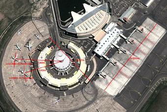 Прежняя кольцевая компоновка терминала позволяла принимать к своим причалам воздушные суда любых мыслимых размеров. Достаточно было лишь отодвигать их от здания терминала вглубь перрона. Места же стоянок самолетов перед новым терминалом выстроены в одну линию, их фронт и, соответственно, габариты самолетов на стоянках ограничены размерами самого здания. Эта схема проявит свою ущербность при первой же попытке принять здесь аэробусы типа А-380, о скором появлении которых проектировщикам нового терминала было заведомо известно.