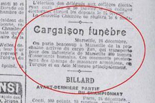13 декабря 1924 года из турецкого порта Мудания в Марсель отбыл английский грузовой корабль «Зан». Никаких документов о грузе заполнено не было. Но сотрудники порта заметили, что 400-тонный груз - это человеческие тела. Полиция попыталась вмешаться, но по указке «сверху» корабль свободно вышел в открытое море.