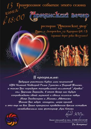 13 июня в 18.00 в ресторане «Амшенский двор» по адресу: г. Сочи, п. Лазаревское, ул. Калараш, 64/5 состоится Армянский благотворительный вечер. Как сообщает Информационный Центр газеты армян России «Еркрамас», средства, вырученные на мероприятии, его организаторы планируют направить на лечение семилетнего Хачатура Хачатряна из Пятигорска, а также в фонд мероприятий, планирующихся к проведению в связи со 100-летием Геноцида армян. Организаторы вечера – Сочинская городская организация «Народная память».