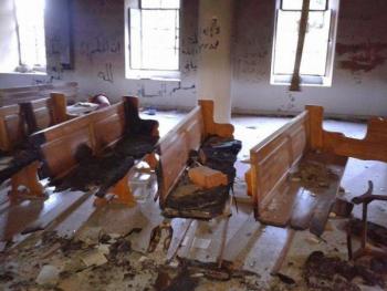 Во время посещения церкви св. Михаила иерарх обнаружил испорченные иконы, сломанные кресты, сожженные богослужебные книги. Помещение совсем не пригодно для проведения богослужений. По словам патриарха, единственной целью исламистов было предотвратить дальнейшее использование храма в качестве дома молитвы. Приходская школа также разрушена.