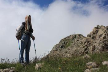 …У нас был крутой подъем. Гора дразнила горизонтом. И, казалось бы, вот, дошли до вершины, на которой стоит башенка из камней, ан-нет - впереди крутой спуск и снова подъем - на скалистой вершине стоит триангулятор. Вот тут-то кое-что и раскрылось. Оказывается, высшая точка горы не там, где стоит триангулятор (наверно, когда-то геодезистов сельчане от души напоили, показывая им свой «хьюрасирютцюн» – слово, которое мне нравится переводить с армянского дословно – «гостелюбие», и те поставили треногу не там, где нужно, но на самом красивом месте). Наш же GPS показал высоту у башенки - 2558 м, высоту у триангулятора 2546 м. Но все-таки стоило пройтись до треноги – это было интересно и красиво. Ну и для тренировки полезно, ведь у нас впереди Арарат. Лалвар и нам сказал: «Есть еще!»