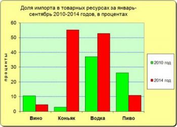 Дело не только в росте импорта этого благородного спиртного напитка (на 54,5 тыс. литров, или же в 2,8 раза). Просто сам объем ресурсов, по «вине» местного производства, за этот период ощутимо сократился – почти на 0,9 млн. литров, или же в 6,5 раза. В силу этого удельный вес импорта возрос под влиянием двух факторов – самого роста ввоза, и уменьшения общего объема ресурсов коньяка.