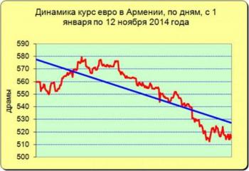 Относительно другой мировой валюты – евро, вывод однозначный: в текущем году его курс в Армении ознаменовался явной тенденцией к снижению. В силу чего у нас ухудшилось соотношение курсов между евро и долларом. Если в начале января оно было равным 1,38, то концу первой декады ноября снизилось до 1,24. Заметим, что точно такое же соотношение (1,24) между евро и долларом имелось за последние дни в России. Разница лишь в том, что за прошедший период текущего года евро в России укрепился на 13%, а в Армении «ослабел» - на 8%.