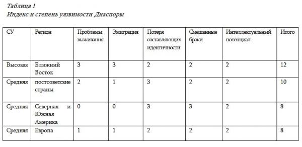 Поскольку критериев уязвимости пять, а максимальный показатель степени уязвимости – 3, то сумма этих критериев и есть индекс уязвимости Диаспоры, который оценивается 15-балльной шкалой (5х3), где 15 баллов показывают максимальную степень уязвимости.