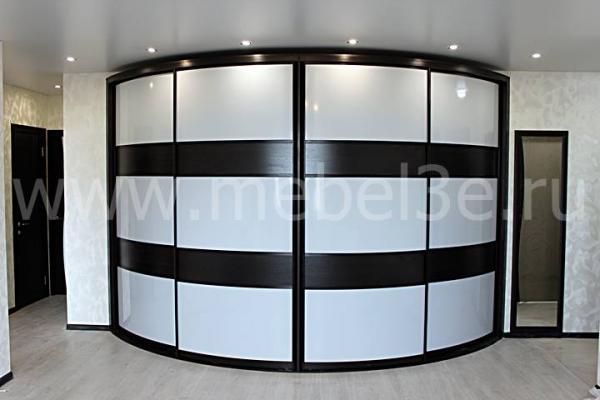Радиусные шкафы купе – это та самая встроенная мебель. Часто их устанавливают в нишах и не используемых углах. Иногда боковые стенки отсутствуют, также как и крыша, делается это для удешевления стоимости шкафа.