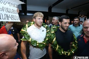 В международном аэропорту "Звартноц" овациями встретили армянских борцов в греко-римском стиле Артура Алексаняна и Максима Манукяна, завоевавших золото на чемпионате мира в Париже.