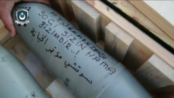 Вот такими снарядами «умеренная оппозиция» в Идлибе обстреливала правительственные войска во время атак и на российскую авиабазу. Надпись на турецком: «Сочи — ваше, Хама — наша». Фото: twitter.com.
