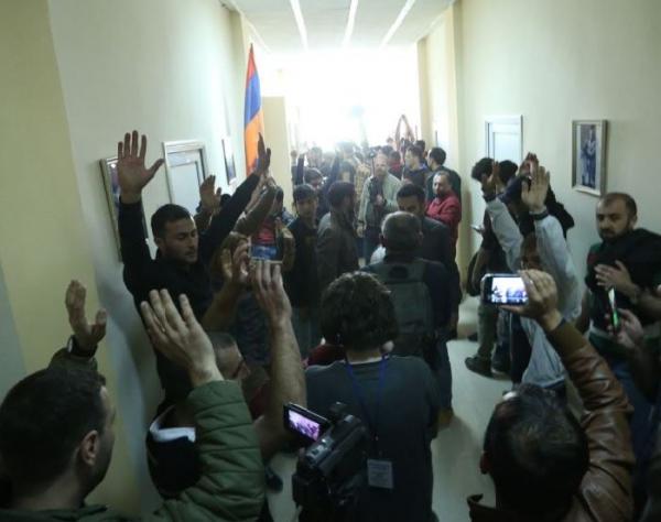 14-го апреля поступило сообщение о том, что участники акции протеста под предводительством Пашиняна, преодолев сопротивление сотрудника службы безопасности, проникли в здание ЗАО "Общественное радио Армении", которое является стратегическим объектом, подлежащим государственной защите и находится под охраной полиции. Участники акции зашли в один из кабинетов организации, выломав закрытую дверь. Сотрудник полиции потребовал у Пашиняна вывести активистов из здания и освободить захваченное здание. Однако организатор акции не передал его законное требование митингующим и не выполнил требование закона "О свободе собраний" по обеспечению нормального течения митинга. Ворвавшиеся люди препятствовали деятельности организации, а Пашинян, удерживая здание, требовал предоставить ему прямой эфир.