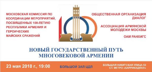 23 мая 2018 года в 19:00 в Большом зале Центрального дома литераторов под эгидой Московской комиссии по координации мероприятий, посвященных 100-летию Республики Армения и героических майских сражений, пройдет торжественный вечер под названием «Новый государственный путь многовековой Армении».