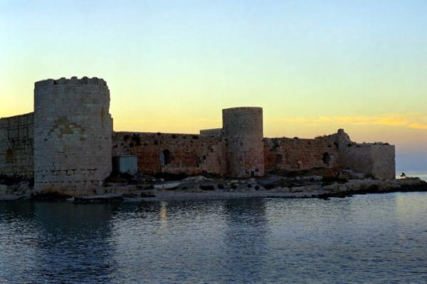 Входящие в порт корабли первым встречают островной форт, охраняющий вход в крепость и гавань. Стена, защищающая город, спускалась к воде и заканчивалась башней, построенной непосредственно у входа в бухту. Стены крепости имели очень интересную конструкцию, в них видны камни с круглым сечением. Средневековые строители использовали длинные каменные колонны, оставшиеся от старых разрушенных построек, которыми скрепляли стены крепости. В стенах и башнях имелись комнаты. Окна комнат в башне выходят на порт, давая возможность стражникам контролировать ситуацию в гавани и на подходах к ней.