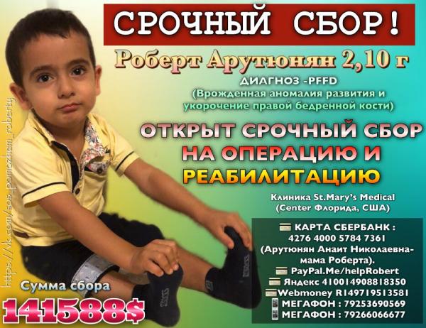 Мама мальчика Анаит Николаевна: «Роберт наш единственный, долгожданный, вымоленный ребёнок. В своем развитии он нисколько не отстаёт от детей своего возраста, а вот в отличие от других деток не может самостоятельно стоять и ходить. Диагноз прозвучал как приговор, ребёнок самостоятельно не сможет стоять и ходить. Смириться с этим невозможно. Данная операция очень важна для нашего сыночка. Мы мечтаем, чтобы наш малыш всё-таки встал на ноги. И этой мечте суждено сбыться только в случае вашей помощи. Мы обычная семья и нам никогда не скопить таких денег на операцию. Время уходит и его не вернёшь, а возможность ХОДИТЬ, может так и остаться несбыточной мечтой для Роберта. Друзья, дорогие наши, любимые, верные помощники, умоляем, помогите нам! Будем искренне благодарны любой вашей помощи!».