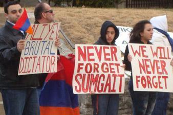 В Вашингтоне перед зданием посольства Азербайджана в США армянские молодежные организации Америки провели накануне акцию протеста в память жертв армянских погромов в Сумгаите. Собравшиеся перед посольством Азербайджана многочисленные представители армянских молодежных организаций Диаспоры, вооруженные плакатами и скандируя лозунги, призывали осудить преступления в Сумгаите.