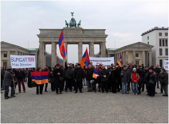 27 февраля с 13.00 до 15.00 Постоянный представитель Нагорно-Карабахской Республики в ФРГ Арутюн Григорян при сотрудничестве с Центральным Советом Армян Германии и поддержке двух армянских общин города Берлина и Армянской Апостольской Церкви провели митинг в память о жертвах погромов армян в Сумгаите 27-29 февраля 1988 года. Как сообщает Информационный Центр газеты армян России «Еркрамас», впервые армянское шествие прошло по центральной улице столицы Германии . Митингующие несли транспаранты по знаменитой Унтер-Ден-Линден от здания Университета, вдоль музеев и посольств и остановились перед Бранденбургскими Воротами, чтоб громко обратиться к общественности. С речами выступили цлены ЦСА Германии, Постпред НКР и активист армянской диаспоры в Германии М.Минасян, призвавшие европейское общество не отворачиваться от трагедии Сумгаита и последовавших за ней погромов армян в Баку, Мараге, Гяндже и других населенных пунктах Азербайджана и НКР, осудив жестокие действия и агрессивную политику руководства Азербайджана.