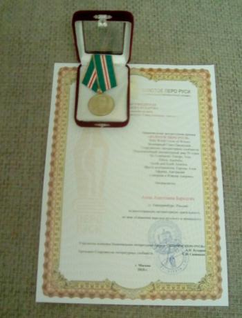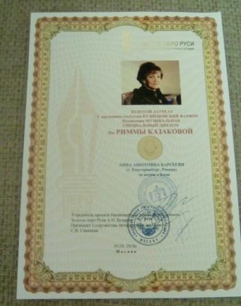 Анна Барсегян также удостоена звания Золотой Лауреат и награждена специальным Дипломом имени Риммы Казаковой со встроенной медалью в номинации музыкальной за песню о Каме. Анну Барсегян поздравили известные поэты, писатели, деятели науки и культуры: В. Бояринов, С. Савицкая, Н. Дроздов. Награда присуждена в рамках Национальной литературной премии «Золотое перо Руси» и Всемирного Союза писателей.