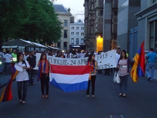 Участники шествия скандировали лозунги ««Нет места убийцам в Евросоюзе!», «Турция, 24 апреля, 1915 г.: 1,5 млн. армян были истреблены» и пели патриотические песни, двигаясь маршем к посольству Турции в Гааге, перед которым сожгли флаг с надписью «1915 год».