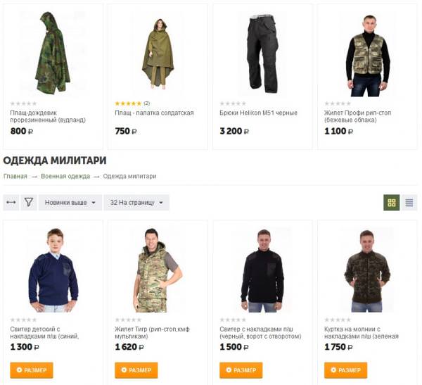 Большим спросом пользуется одежда в стиле милитари, ассортимент которой включает в себя разнообразные товары - куртки и рубашки, брюки и жилеты, дождевики и толстовки, плащи и блузы, свитера и другие изделия, включая одежду и для детей. Стоимость на товары низкая, а качество позволяет использовать одежду долгие годы, в полной мере соответствуя запросам и требованиям потребителей.