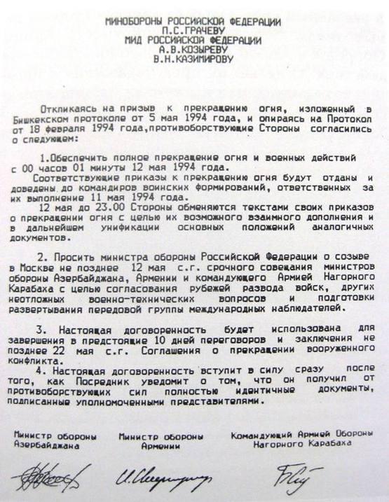 17 лет назад, 5 мая 1994 года, в столице Кыргызстана Бишкеке был подписан Протокол о бессрочном прекращении огня между Нагорно-Карабахской Республикой, Азербайджаном и Арменией. Спустя несколько дней руководители оборонных ведомств Армении, НКР и Азербайджана в совместном письме министерствам обороны и иностранных дел Российской Федерации выразили согласие обеспечить полное прекращение огня с 00 часов 01 минуты 12 мая 1994 года (ксерокопия письма прилагается).