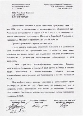 Спустя два с половиной месяца, 26 июля 1994 года, руководители оборонных ведомств НКР, Армении и Азербайджана обратились к МО и МИД России, а также Председателю Минской Конференции СБСЕ (ныне - ОБСЕ) по Нагорному Карабаху Яну Элиассону. В совместном письме они в очередной раз подтвердили «свою твердую решимость продолжать выполнять и в дальнейшем свои обязательства по прекращению огня».
