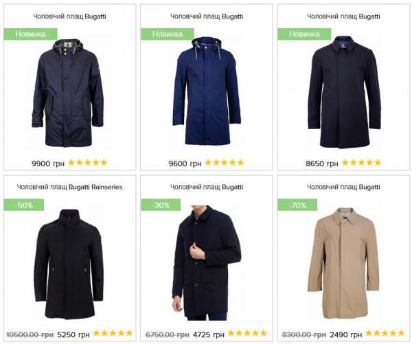 В каталоге можно подобрать добротный, качественный, стильный плащ. Стоимость на изделия разная и начинается с 1170 гривен - это светло-серый плащ, который отлично подойдет деловому мужчине. Универсальность дизайна позволяет носить его как молодому человеку, так и возрастному. Наиболее высокая цена на плащи Bugatti - 9900 грн. Это современная, молодежная куртка синего цвета, выполненная с применением инновационной технологии «Smart Light». В светлое время суток куртка накапливает свет, за счет чего светится в темноте.