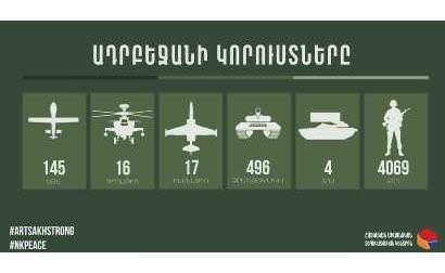 Согласно данным штаба, с 27 сентября по сегодняшний день ВС Арцаха поразили 16 вертолетов, 17 самолетов, 145 БПЛА, 496 единиц бронетехники, в основном танки, 4 РСЗО «Смерч», 4 тяжелые огнеметные системы «ТОС-1А» противника. У противника свыше 4069 погибших. С армянской стороны, согласно предварительным данным, погиб 331 человек.