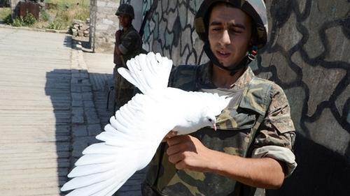 Под навесом отдыхал от службы наряд. Кто-то задумчиво играл в шахматы. Кто–то кормил голубей. Да, да, на линии обороны кроме собаки Рыжика жили два белоснежных голубка. Как тут не вспомнить Пикассо с его «Голубем мира». За пернатыми ухаживает лейтенант Эдмон Сарибекян. Специально для журналиста он запускает красивых птиц в знойное небо. Но они тут же приземляются на плакат «Непобедим тот народ, который духом крепок! Гарегин Нжде, царский генерал».