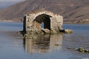 Жители села Толорс отмечают, что каждый год при повышении уровня водохранилища вода полностью покрывает купол церкви.