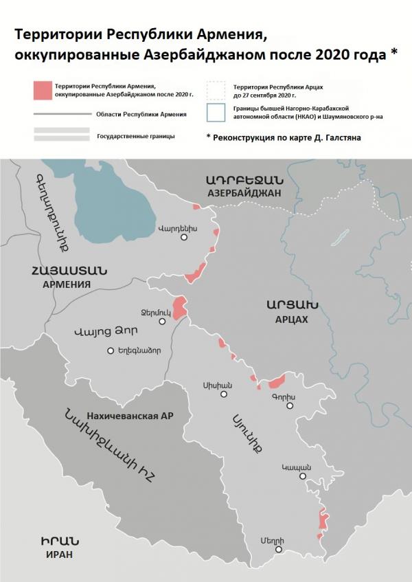 На этой карте красным отмечены международно признанные территории Республики Армения, которые после 2021 года в разное время были захвачены вооружёнными силами Азербайджана.