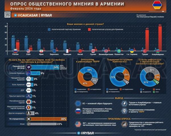 Социологический опрос становится очередным элементом в борьбе за восприятие. В Армении формируется ситуация, при которой внешние структуры участвуют в конструировании внутренней политической реальности, а сами выборы всё больше превращаются в управляемый процесс на фоне глубокого кризиса доверия к власти.