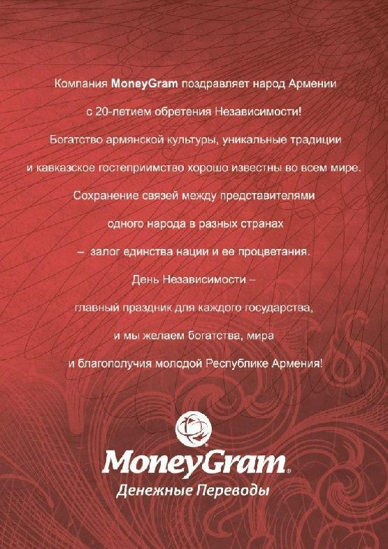 Компания Moneygram поздравляет армян с Днем независимости Республики Армения