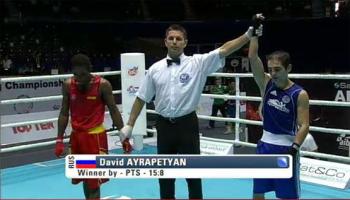 Выступающий за Россию армянский боксер Давид Айрапетян (49 кг), победив в четвертьфинальном бою, проходящего в Баку чемпионата мира по боксу, испанца Хосе Келвина де ла Ниеве Линареса (De La Nieve Linares Jose Kelvin), вышел в полуфинал соревнований. Как сообщает Информационный Центр газеты армян России «Еркрамас», сегодняшней победой он обеспечил себе бронзовые медали мирового первенства. Напомним, что ранее он уже завоевал путевку на Олимпийские игры 2012 года. Соперником Давида Айрапетяна в полуфинале, который пройдет 7 октября, стал китаец Зу Шиминг (Zou Shiming), победивший таиландца Каева Понгпрайона (Pongprayoon KaeW).