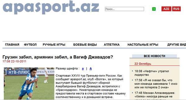Стресс, который испытали бакинские журналисты, после просмотра матча российской премьер-лиги между клубами «Краснодар» и «Волга», заставил их сесть за компьютер и поделиться с читателями своим возмущением. Прежде всего, они отметили, что нижегородская команда «Волга», за которую выступает Вагиф Джавадов, не предоставила ему места в стартовом составе. Более того, как оказалось, 22-летний азербайджанский нападающий после трансфера в Россию был включён в основной состав всего 1 раз. Но даже не это было самым страшным для журналистов «Апаспорта» в восприятии прошедшего футбольного матча. Оказалось, что все же «брошенный в бой» на 66-й минуте Вагиф Джавадов, стал беспомощным свидетелем того, как выступающий за «Краснодар» форвард сборной Армении забил гол в ворота команды Джавадова. «В матче, в котором Джавадову отличиться не удалось, голы забили грузин Марцваладзе и армянин Мовсисян», - констатировали азербайджанские журналисты и даже вынесли этот факт в заголовок своей публикации.