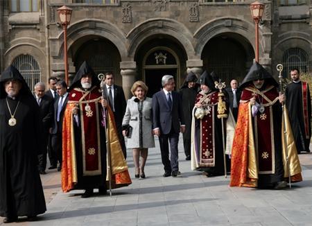 Справка. Гарегин II (Нерсесян) – действующий Патриарх и Католикос всех армян, глава Армянской Апостольской Церкви. 27 октября 1999 года после смерти Католикоса Гарегина I Национальный Церковный собор Армянской Апостольской Церкви избрал архиепископа Гарегина Нерсесяна 132-м Патриархом и Католикосом всех армян. Резиденция Верховного Патриарха всех армян – Первопрестольный Эчмиадзин. «Эчмиадзин» означает «сошел Единородный Сын Божий». Именно так был назван кафедральный собор и близлежащий монастырь. Святому Григорию было видение Единородного Сына Божьего. Он сошел с небес с золотым молотом в руке и, ударив по земле армянской, указал место построения первого кафедрального собора. Этот алтарь был впоследствии возведен на месте, где золотой молот Сына Божьего коснулся земли. Вокруг алтаря в 303 году и был создан кафедральный собор.