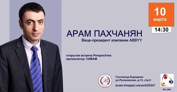 В рамках проекта «Perspectives», реализуемого Сообществом Интеллектуального Взаимодействия Армянской Молодежи (СИВАМ), 10 марта в Москве пройдет встреча с вице-президентом знаменитой компании ABBYY Арамом Пахчаняном. Как сообщает Информационный Центр газеты армян России «Еркрамас», гость расскажет об образовательном фонде «Айб», о том, как выводить технологические и интернет стартапы на глобальный уровень, как привлечь инвестиции в IT стартап, а также ответит на вопросы слушателей.