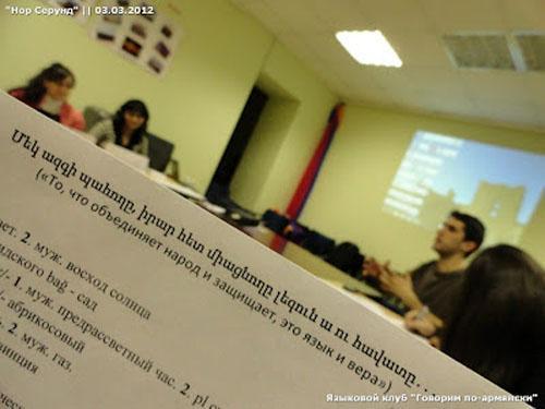 Языковой клуб «Хосуменк Айерен» («Говорим по-армянски») открылся в Санкт-Петербурге усилиями Армянской Молодежной Организации «Нор Серунд». Как сообщает Информационный Центр газеты армян России «Еркрамас», главное условие работы клуба заключается в том, что все его участники говорят здесь только на армянском языке, не стесняясь и не боясь ошибок.