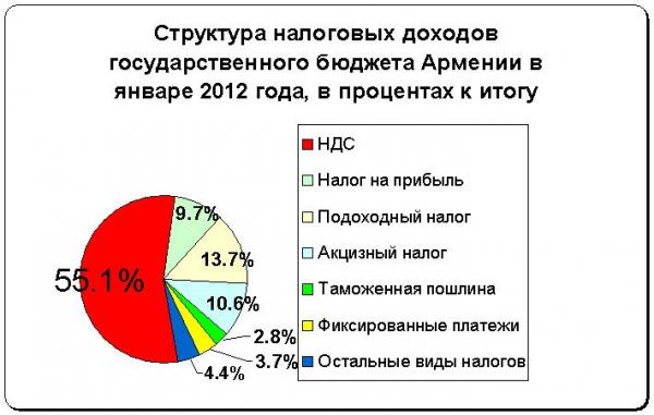 В силу этого абсолютный прирост НДС (почти 2,5 млрд. драмов) смог компенсировать заметный спад по линии ряда других налогов. Правда, эта компенсация обязана и положительным сдвигам в динамике подоходного налога – его в январе текущего года налогоплательщики уплатили на 0,9 млрд. драмов больше, чем в аналогичном месяце прошлого года.