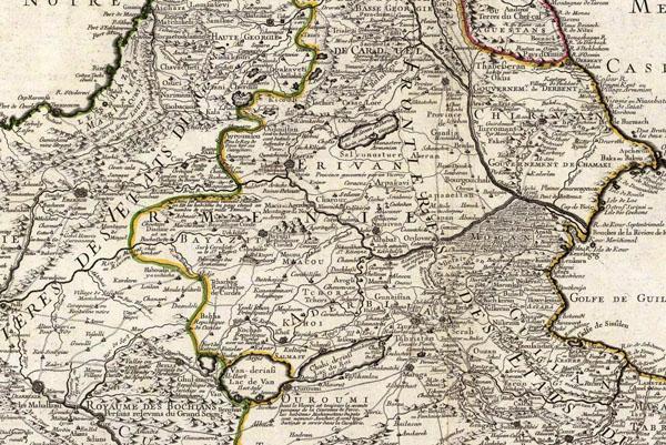 На фрагменте довольно чётко видно, что историко-географический термин «Армения» распространяется на территории между Евфратом и Курой. Как тут не вспомнить Журдена де Северака, французского автора и монаха-путешественника XIV века, отмечавшего, что «Эта Армения в длину тянется от Себаста [Сиваса] до равнины Ороган [Мугань], а в ширину от гор Баркар до Тауриса [Тебриза]…». Эти данные опровергают большинство домыслов и утверждений азербайджанских пропагандистов. Также мы видим, что Армения, вернее её четко разграниченная по Куре чёрным пунктиром персидская (восточная) часть, включает в себя города Эривань, Нахичевань, Ганджа, Бердаа и Шамкур. Вместе с тем на карте обозначены собственно армянские топонимы, такие, как Капан, с недавних пор «переименованный» в азербайджанской исторической литературе на «Гафан», Ордовар («Ордубад»), Бджни, Двин, а также эллинизированная форма именования величественной древнеармянской столицы Арташат – «Артаксата».