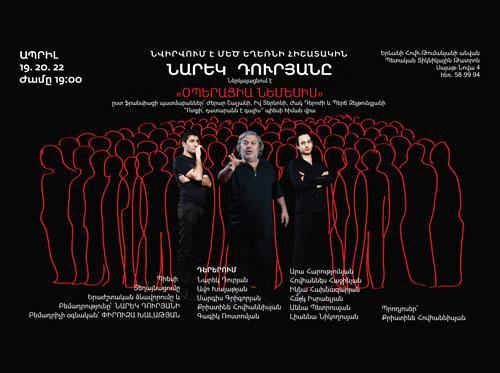 Представление режиссера и актера Нарека Дурьяна “Операция “Немезис”” является средством поднятия общечеловеческих проблем благодаря новым решениям. Сценарий спектакля основан на работах известных французских ученых Жерара Шальяна, Ива Тернона, Жака Дерожа, протоколов суда Соломона Тейлеряна и пьесе Перча Зейтунцяна “Встать, суд идет!”. Представление, посвященное памяти жертв Геноцида армян, в первый раз было представлено на суд зрителей 19 апреля.