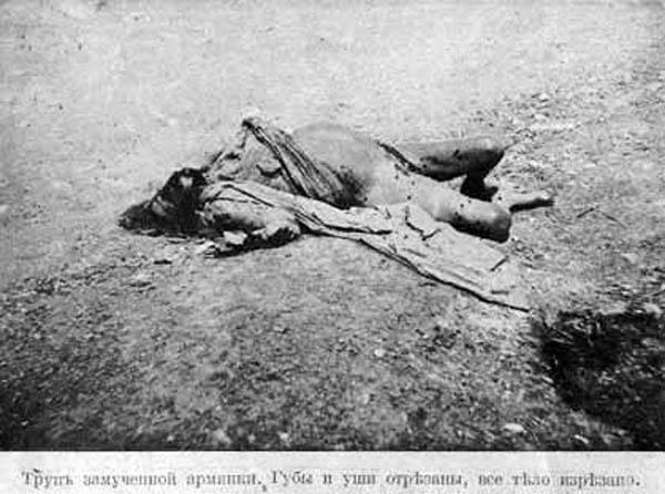 (На фото труп замученной армянки. Губы и уши отрезаны, все тело изрезано - российская газета "Искра" 18 октября 1915 года )