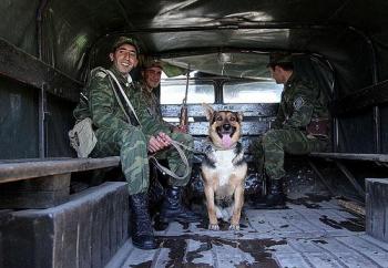 Охрану государственной границы наряду с личным составом заставы несут три овчарки – Цезарь, Веста и Леди. Веста первой смиряется с присутствием посторонних и смотрит на нас вдумчивым проникновенным взглядом. Цезарь, известный способностью прокусить спецодежду для тренировки служебных собак, продолжает демонстрировать клыки. Он на страже и готов защитить свою территорию от любого посягательства.