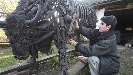 Как сообщал Телеграф, Роман Бейбутян решил оригинальным образом использовать старые автомобильные запчасти, за три месяца собрав из них зубра в натуральную величину. Идея создания у него возникла после того, как он увидел рядом картинки зубра и "Терминатора". Продать скульптуру весом более тонны гродненский умелец был готов за 5,5 тыс. долларов.