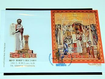 Почтовый блок, посвященный создателю армянской письменности Месропу Маштоцу погашен во вторник в Ереване в рамках мероприятий, приуроченных к 500-летию армянского книгопечатания.