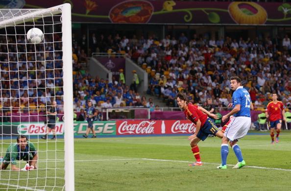 Крайний защитник "Милана" старался абстрагироваться от любого атакующего футбола. Итальянцы предпочитали действовать через левую бровку, где Кьеллини, доходя до центра, старался находить передачами Балотелли или Кассано. За исключением одного заброса в исполнении Пирло на СуперМарио, иных атакующих действий у "Скуадры адзурры" не было. По сравнению с первым матчем в группе, испанцам удалось взять мяч под собственный контроль. Это и стало главным оружием "Фурии рохи". В момент действия состояния первой свежести защитники итальянцев ещё успевали в самый последний момент прикрывать угрозы и подстраховывать Буффона. Удар Хави с линии штрафной был тревожным звонком. Звонком, к которому чемпионы мира-2006 не прислушались. В другой раз пиренейцы отказывались прощать своих соперников. Андрес Иньеста разрезал защиту фирменным пасом в свободную зону на правый край штрафной площади, где Фабрегас идеально оттёр от мяча Кьеллини (позже станет ясно, почему Джорджо сыграл ниже своего уровня), нашёл передачей голову Сильвы. Давида не успел накрыть Барцальи, Буффон уже находился в полусогнутом положении, беспокоясь за свой ближний угол. Атакующему полузащитнику "Манчестер Сити" оставалось поразить головой дальний угол, что он, под шум трибун, успешно проделал за считанные секунды.