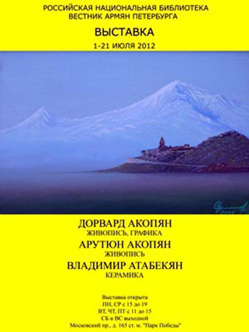 4 июля в Санкт-Петербурге в выставочном зале Российской Национальной Библиотеки (Московский проспект, 165, ст. метро «Парк Победы») открылась выставка работ трех художников: члена Союза художников Санкт-Петербурга и Международной федерации художников при ЮНЕСКО (IFA) Дорварда Акопяна, петербургского художника Арутюна Акопяна и скульптора-керамиста Владимира Атабекяна.
