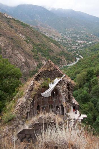 Тем удивительней, что цвета так и не поблекли, не потеряли яркости на протяжении долгих столетий. Ведь использованные здесь краски из натуральных красителей были такие же, как и по всей Армении: красный цвет – из «вордан кармира», изготовленного из эндемического корневого червя, распространенного в Араратской долине, зеленый цвет – из железной охры, синий цвет – из чернильного орешка, краски делались из шафрана, бессмертника, из зеленой ореховой скорлупы... Можно, конечно, приписать дело и некой мистике, особому покровительству Кобайру со стороны то ли природы, то ли высших сил. Ведь, как гласит местная легенда, в пещере, чуть ниже церкви, похоронена грузинская царица Тамара. Она так и называется – пещера царицы Тамары.
