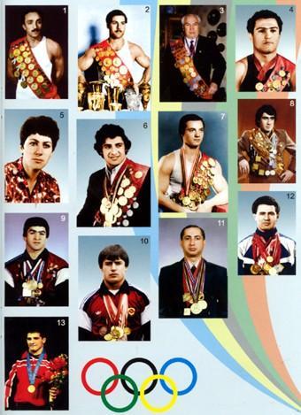 Грант Шагинян (спортивная гимнастика, две медали на ОИ-1952 в Хельсинки); Альберт Азарян (спортивная гимнастика, две медали на ОИ-1956 в Мельбурне и одна медаль на ОИ-1960 в Риме); Игорь Новиков (пятиборье, ОИ-1956 и ОИ-1964 в Токио); Владимир Енгибарян (бокс, ОИ-1956); Фаина Мельник (атлетика, метание диска, ОИ-1972 в Мюнхене); Юрий Варданян (тяжелая атлетика, ОИ-1980 в Москве); Эдвард Азарян (спортивная гимнастика, ОИ-1980); Оксен Мирзоян (тяжелая атлетика, ОИ-1988 в Сеуле); Левон Джулфалакян (греко-римская борьба, ОИ-1988); Исраел Милитосян (тяжелая атлетика, ОИ-1992 в Барселоне); Грачья Петикян (стрельба, ОИ-1992); Мнацакан Искандарян (греко-римская борьба, ОИ-1992); Армен Назарян (греко-римская борьба, ОИ-1996 в Атланте).
