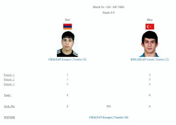 Борец греко-римского стиля из Армении Карапет Чалян (в/к 74), успешно пройдя двух спортсменов в серии утешительных поединков, становится бронзовым призером проходящего в Таиланде молодежного чемпионата мира по борьбе.