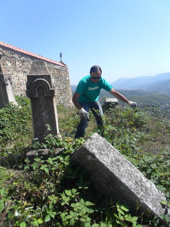 В первую очередь группа побывала в церкви, после чего только начала свою работу: надо было очистить территорию близ церкви, где надгробные камни уже покрылись травой.