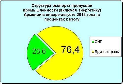 Из продукции отечественной промышленности в страны СНГ ныне большими партиями вывозятся только коньяки и вина. Так, по группе алкогольных напитков (в которых фигурирует в основном коньяк, и отчасти вина) структура следующая: в январе-августе текущего года 94,8% их экспорта пришлась на страны СНГ, а на «другие» - лишь 5,2%. Добавим, что вывоз алкогольных напитков в указанном периоде составил 41,1 млрд. драмов, или же 15,2% от общего объема экспорта продукции отечественной промышленности.